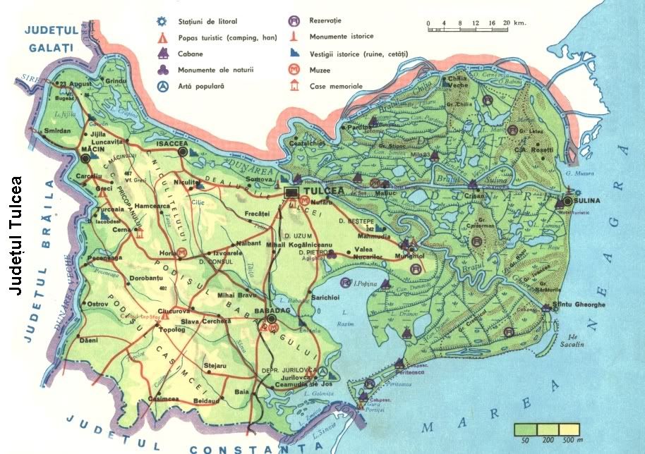 Judetul Tulcea - municipii si orase: Tulcea, Macin, Babadag, Isaccea, Sulina."Harta rutiera - Harta turistica a judetului Tulcea"